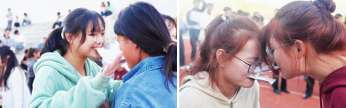第三个项目为“面粉传递”,所有参赛队员依次咬住扑克牌运送面粉, 在三分钟内,运送面粉最多者获胜。只听一声令下,同学们纷纷屏住呼吸,不断尝试着传递方式,尽己所能减少自己队面粉减少的损失,可谓是使出了浑身解数,留下了一幕幕珍贵的画面。