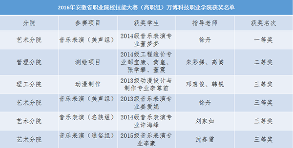 在音乐表演竞赛项目上,我院2014级董梦梦同学唱功扎实,技艺精湛,在指导老师徐丹的悉心帮助下一举夺得美声组一等奖的优异成绩。此外,我院2013级姜爱妮同学在同一项目上荣获美声组三等奖(指导老师徐丹);2014级许海峰同学荣获音乐表演项目民族组三等奖(指导老师刘家如);2015级李豪同学荣获音乐表演项目通俗组三等奖(指导老师沈春雷)。在测绘竞赛项目上,由我院2014级工程造价专业邹宝康、黄皇、张学攀、董震4位同学组成的参赛团队在指导老师朱彩娣、高嵩的悉心指导下,在一级导线测量上表现突出,荣获了二等奖的好成绩。在动漫制作项目上,我院2013级动漫设计与制作专业李尊前同学在指导老师邓惠俊、韩锐的悉心指导下,荣获该项目三等奖。