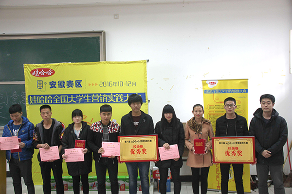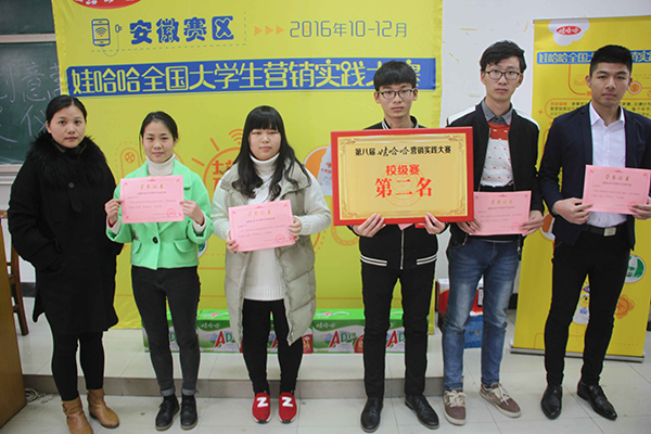 经过一个月的紧张比赛,由院创业指导委员会、院就业办、院团委联合举办的第八届全国大学生哇哈哈营销实践大赛校级赛圆满落下帷幕。12月7日下午,在3202教室隆重举行了第八届全国大学生哇哈哈营销实践大赛校级赛的颁奖典礼。院创业指导委员会副主任、财经分院院长李德明,杭州娃哈哈集团安徽分公司高校市场总监陈晓春先生,学院团委洪丽老师,财经分院辅导员盛婷婷老师应邀参加本次颁奖典礼。