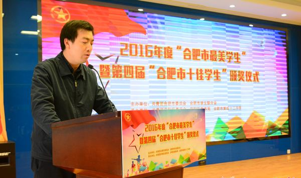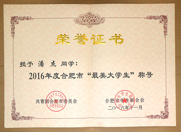 3月27日下午,由共青团合肥市委员会、合肥市学生联合会共同举办的2016年度“合肥市最美学生”暨第四届“合肥市十佳学生”颁奖仪式在四十二中举行。20名中学生、10名中职生、10名大学生成为“合肥市最美学生”,我院潘杰同学因大学期间表现优异、积极践行社会主义核心价值观在此次寻访评选活动中被授予合肥市“最美大学生”荣誉称号。