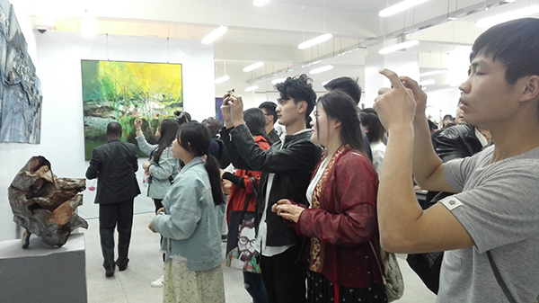 展览现场,高达935件的参展作品聚焦当今艺术前沿,类型独具特色。唯美的传统绘画、当代的架上艺术、实验艺术与行为艺术的融合、古典音乐与装置艺术的嫁接、全息影像时空雕刻更加彰显艺术的时尚风貌。整个展览既有安徽艺术大师精心准备的艺术饕餮大餐,也有90后学生们的清新小品;可谓高潮迭起、异彩纷呈。形式多样的艺术作品让同学们赞叹不已、有的近距离观看画面细节、有的三五成群交流心得、有的纷纷拍照留作资料。