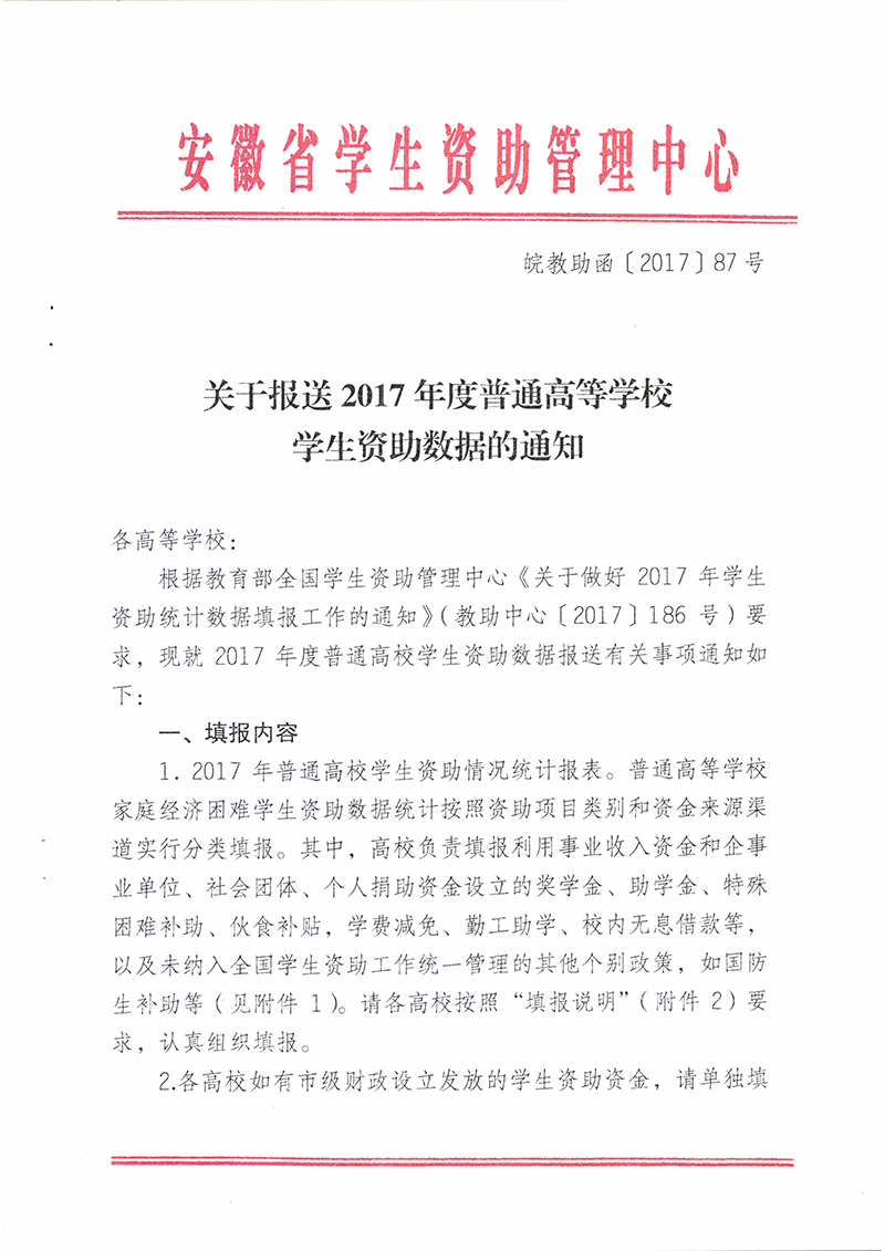 关于报送2017年度普通高校学生资助数据的通知