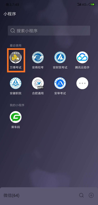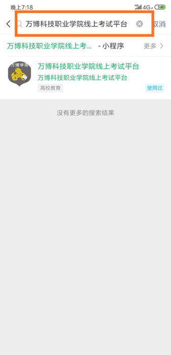 打开手机微信,在“发现”页面中选择小程序查找页面,在搜索框中输入“万博科技职业学院线上考试平台”进行查询,在查询结果中点击“万博科技职业学院线上考试平台”小程序即可打开登录页面;