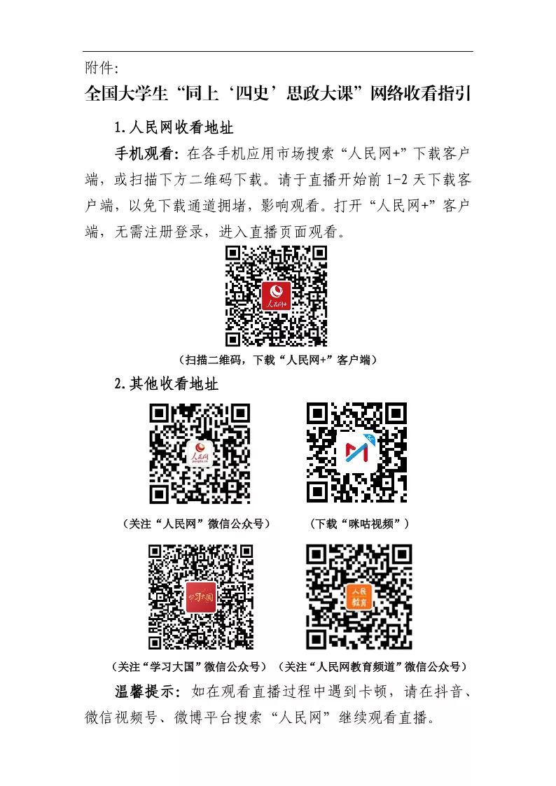 为深入贯彻落实习近平总书记关于深化思想政治理论课改革创新和“大思政课”的重要指示批示精神,全面落实习近平总书记在党史学习教育动员大会上的重要讲话精神和认真落实中央和省委、省委教育工委关于开展党史学习教育的有关部署安排,按照校党委党史学习教育领导小组具体要求,根据《教育部社科司关于组织全国大学生“同上‘四史’思政大课”的通知》(教社科司函〔2021〕63 号)文件精神,为推进我校党史学习教育深入扎实开展,现决定组织我校大学生和思想政治理论课教师参加教育部社科司与人民网联合举办的“同上‘四史’思政大课”活动。现将有关要求通知如下: