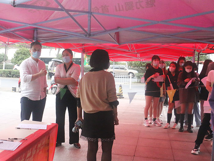 疫苗接种现场分为咨询登记区、体温测量区、信息录入登记区、接种区以及留观区。师生们分批次、排好队、戴好口罩有序地等待接种新冠疫苗。金湖社区志愿者为师生答疑解惑维持秩序,引导同学们佩戴好口罩,排队测量体温、签署疫苗接种知情同意书等学生返校相关工作。