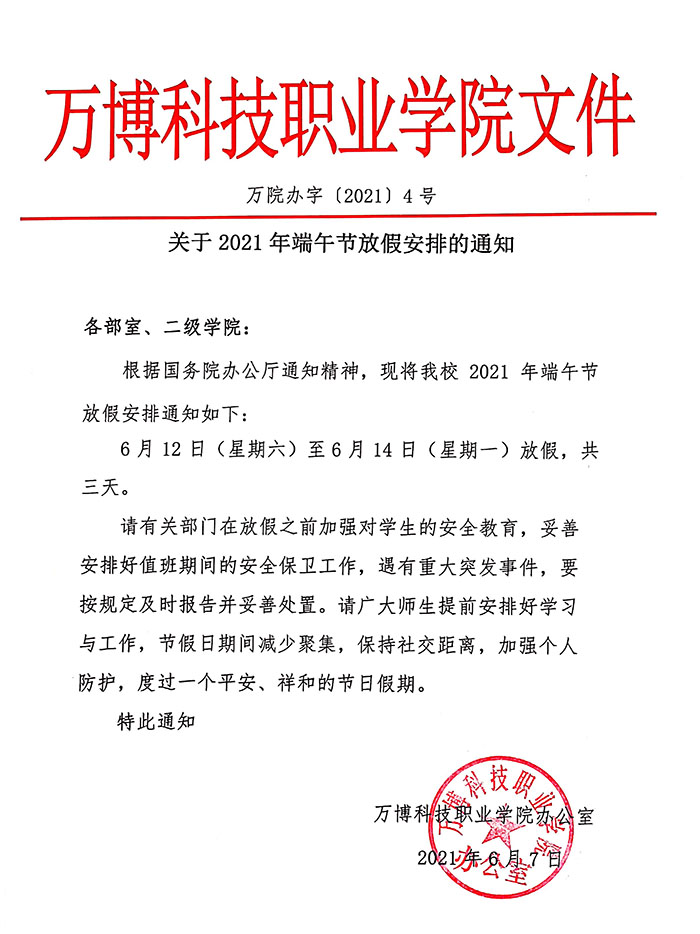 根据国务院办公厅通知精神,现将我校2021年端午节放假安排通知如下: