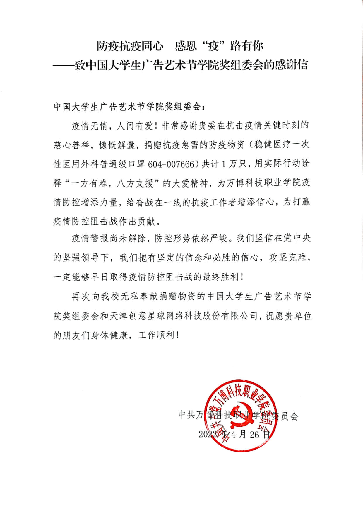 防疫抗疫同心 感恩“疫”路有你——致中国大学生广告艺术节学院奖组委会的感谢信