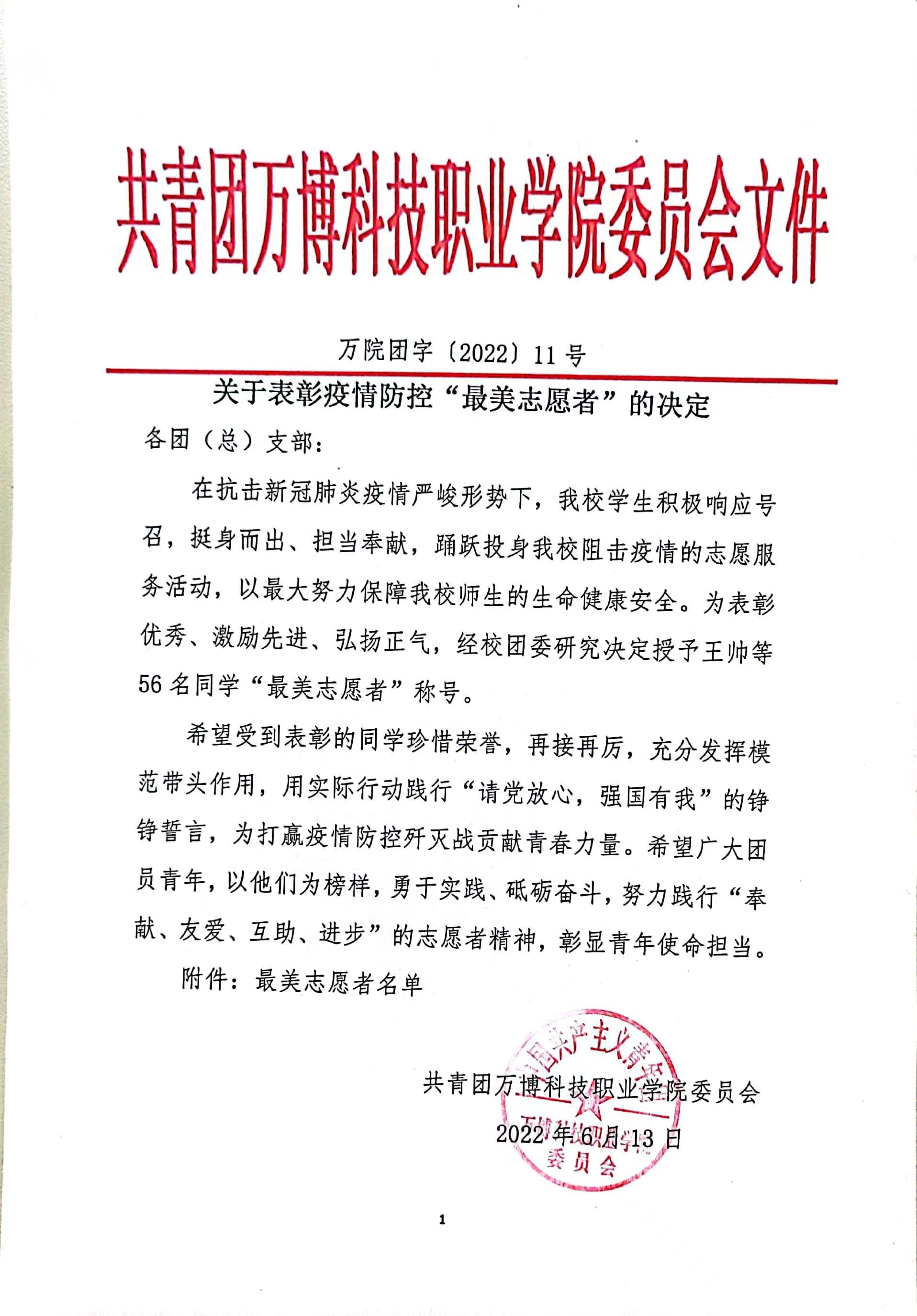 关于表彰疫情防控“最美志愿者”的决定