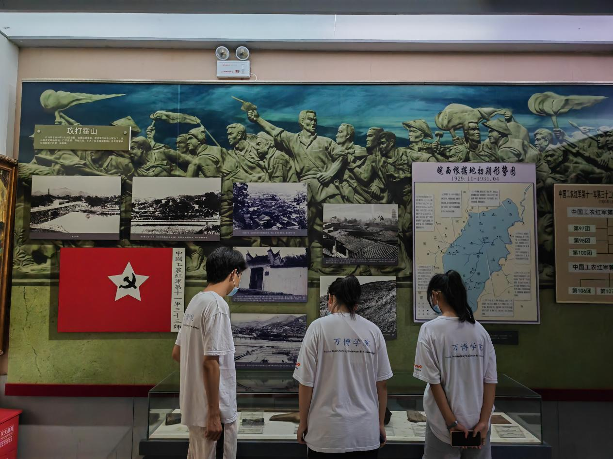 7月3日,实践队来到金寨县革命博物馆。队员们参观了革命历史陈列馆、革命烈士事迹陈列馆、开国将军厅,观看了大量历史资料和文物,并充分学习了金寨县革命历史,以及将领洪学智、徐立清等革命烈士的英勇事迹。令队员们印象深刻的是刚成立第十天的红33师于1930年正月初一凌晨,在霍山游击队、赤卫军2000多人配合下,分三路攻克霍山县城,这是红军在安徽省攻下的第一座县城。此次战役让群众备受鼓舞,纷纷加入红军革命队伍。
