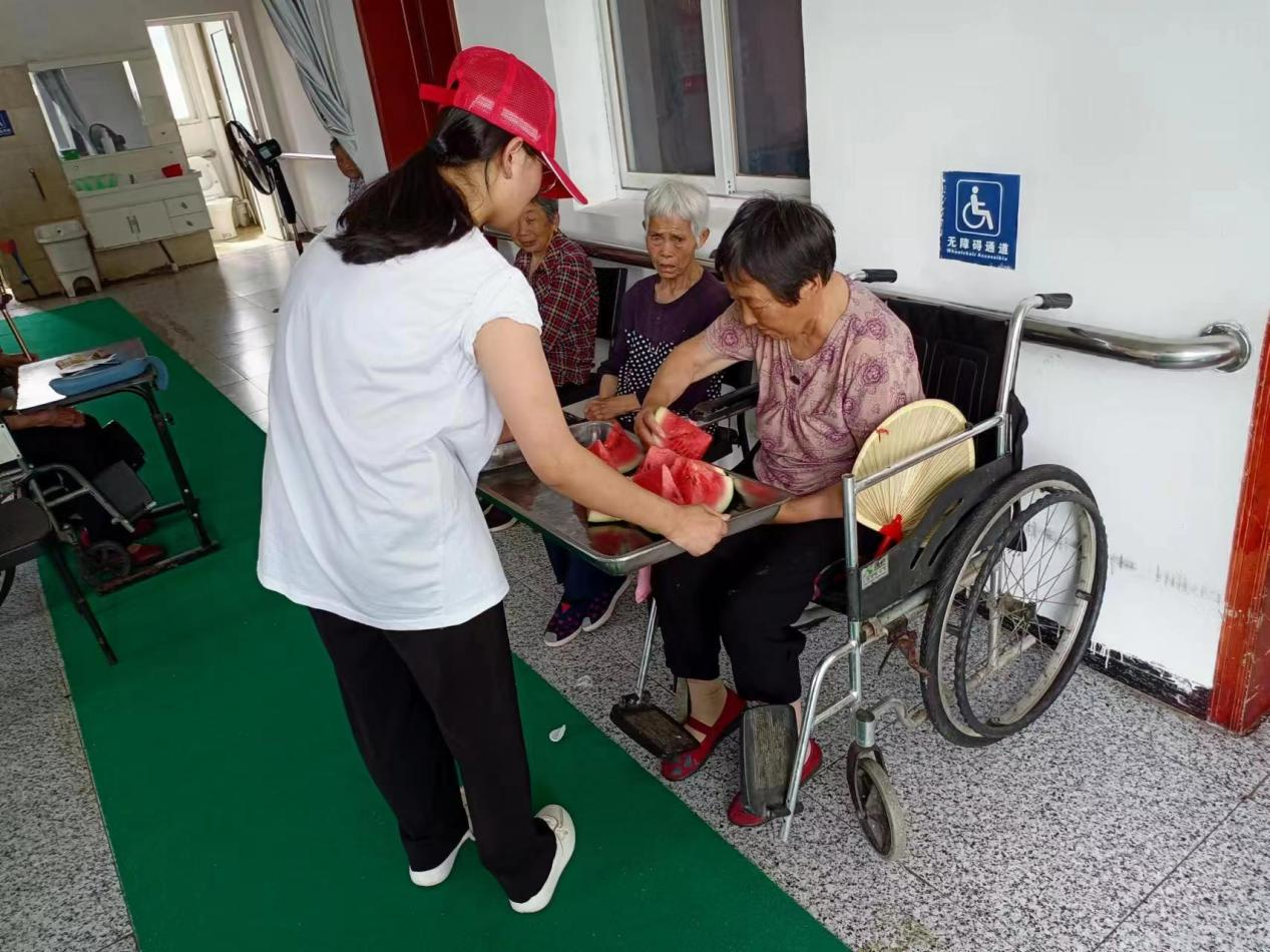 7月4日,实践队来到巨人康养中心慰问老人。在院长的带领下,实践队了解了敬老院的相关情况,熟悉老人们的日常生活。队员们为老人送上消暑的西瓜,并与他们促膝长谈,给老人们带去心灵上的慰藉,让他们感受到青年的朝气和社会的温暖。在交流过程中,有两名老党员的精神令队员们十分动容,一位是89岁高龄的刘连城同志,他1955年入党,一身致力于为人民服务的伟大事业上,敢于吃苦,甘于奉献,鞠躬尽瘁,他始终坚持为党、为人民的赤诚忠心让队员们深深地佩服;另一位是71岁的王成利同志,他和他的妻子在物资匮乏的年代,资助五名孤儿吃饭、上学。他以上山砍柴补贴家用,他的妻子因劳累过度离他而去,所有的重担压在王成利的身上。面对困境,他克服艰难险阻,依然资助五名孤儿直至现今,最大的孩子刚上大学,最小的还在上初中。他说,“身为党员就要起到带头作用,在大灾大难面前一定要冲到最前面,要做一个对社会有用的人,为人民服务,紧跟党走,服从党的一切安排,完成党的一切任务”。