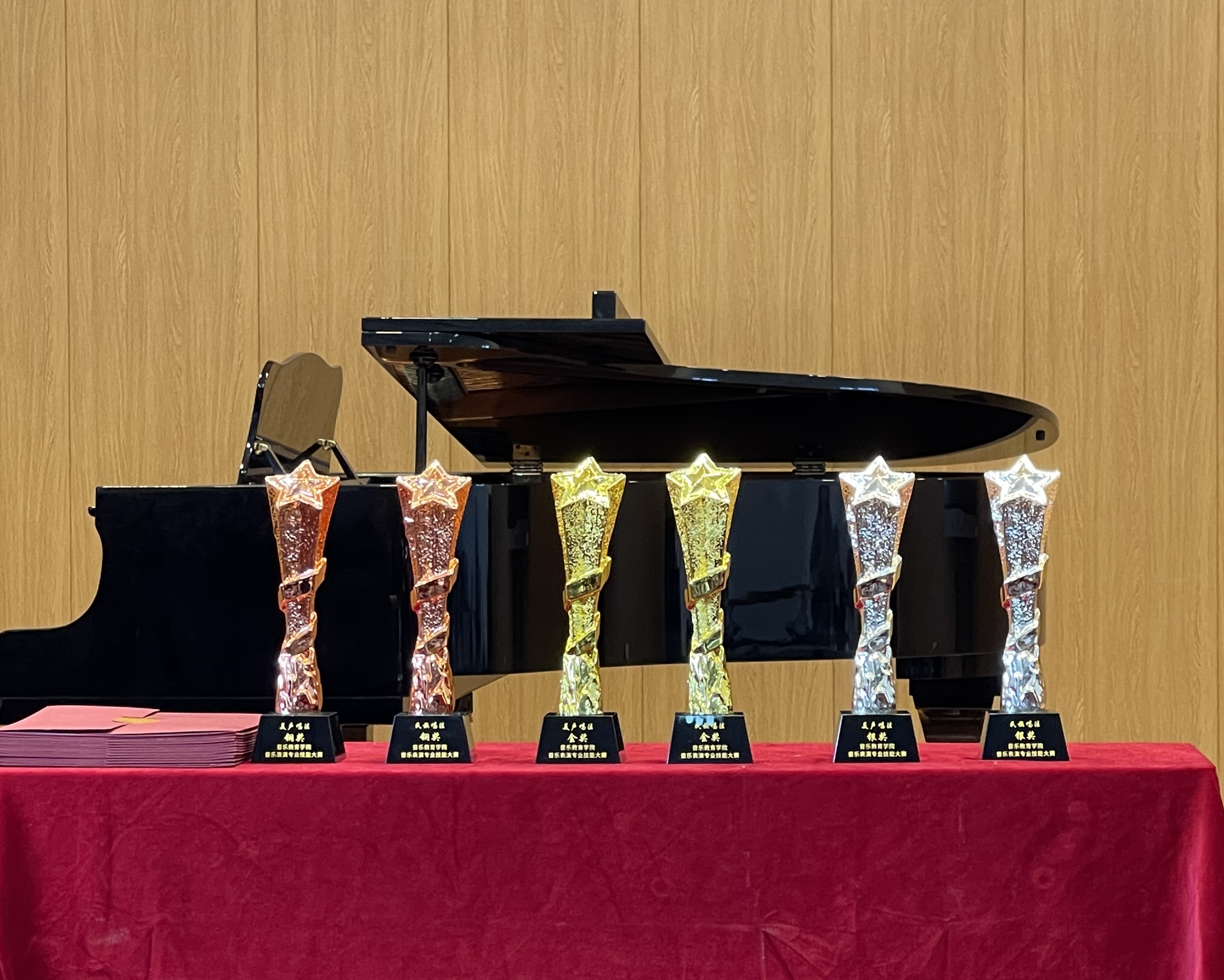 本次展演共分为两个环节。第一项进行的是“2023年音乐教育学院音乐表演专业技能大赛颁奖典礼”。此次技能大赛美声、民族两种唱法组别共角逐出金、银、铜奖各2名,优秀奖6名。沈春雷、刘家如分别为民族唱法、美声唱法金、银、铜奖获奖同学颁发奖杯和证书,吴乾康、徐丹分别为民族唱法、美声唱法“优秀奖”获奖同学颁发证书。