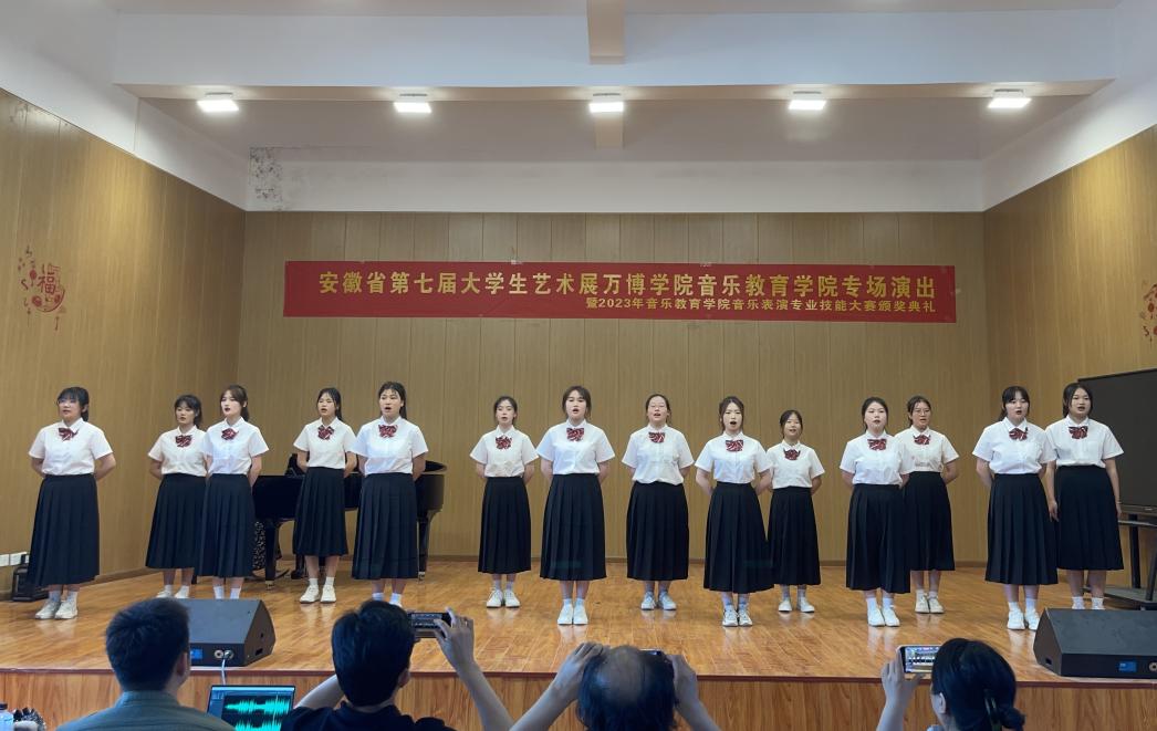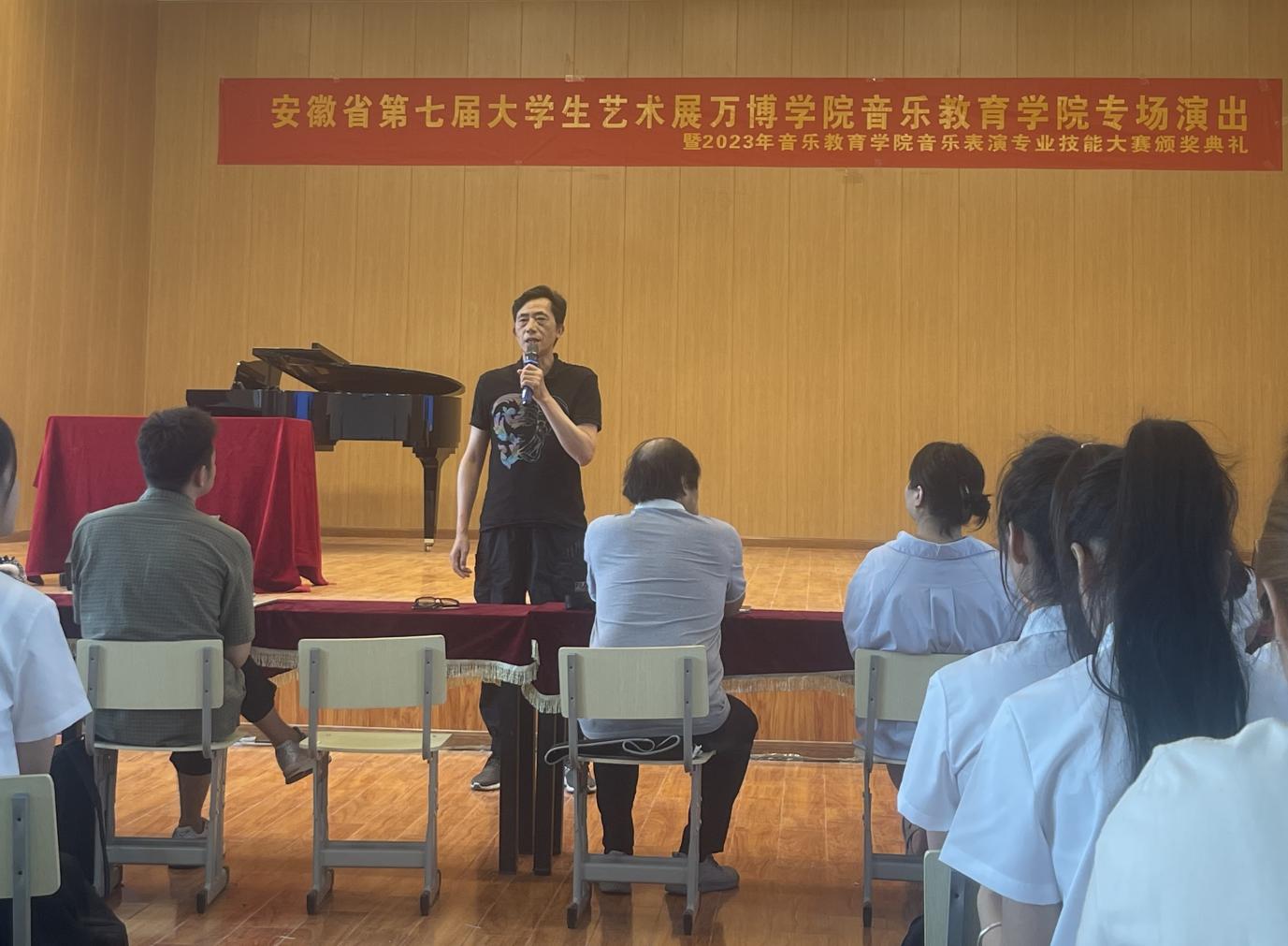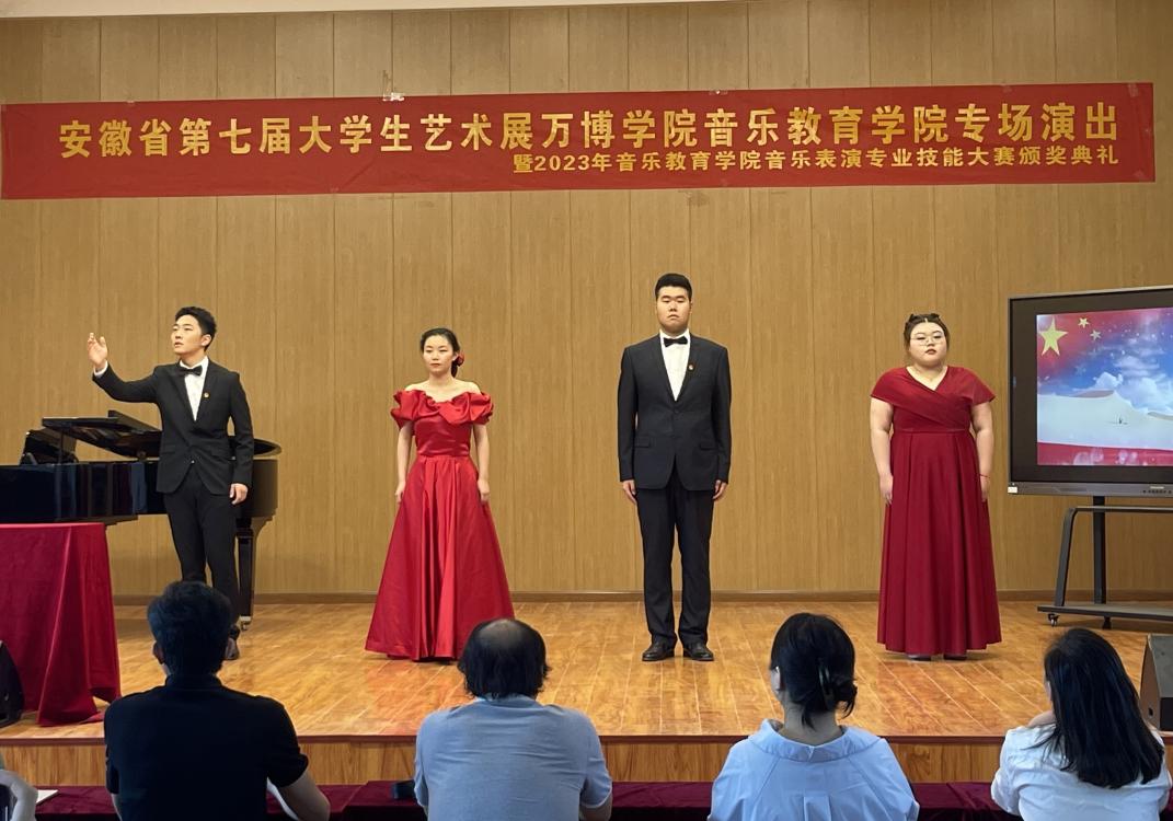 为深入学习贯彻党的二十大精神和党的教育方针,落实中共中央办公厅、国务院办公厅印发的《关于全面加强和改进新时代学校美育工作的意见》及皖教秘《安徽省教育厅关于举办安徽省第七届大学生艺术展活动的通知》,6月14日,音乐教育学院在实训中心音乐厅举办了“安徽省第七届大学生艺术展万博学院音乐教育学院专场演出暨2023年音乐教育学院音乐表演专业技能大赛颁奖典礼”。音乐教育学院院长沈春雷、音乐教研室主任吴乾康以及音乐表演专业全体师生出席了本次展演。