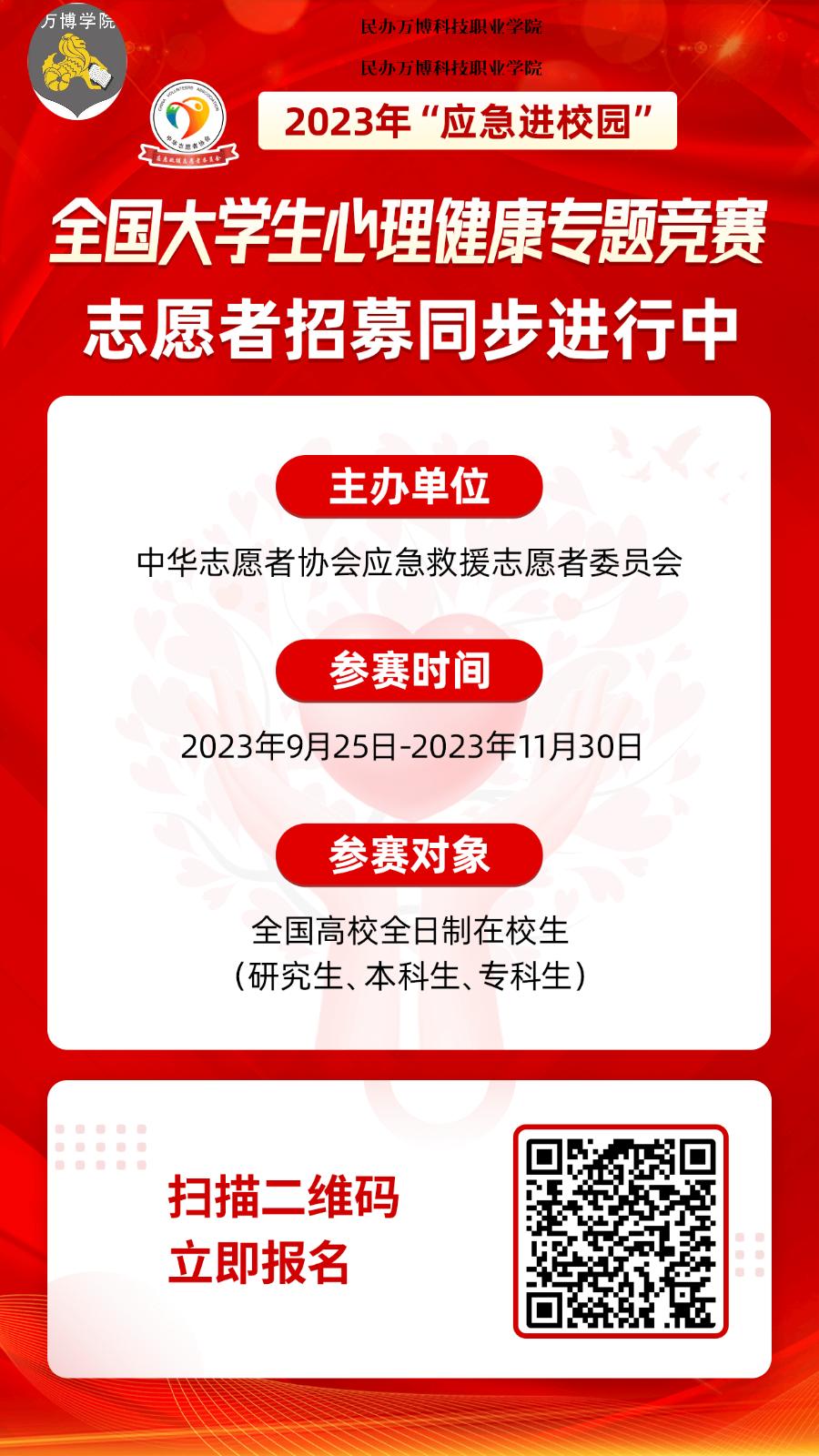 为认真落实习近平新时期代中国特色社会主义思想,深入贯彻《健康中国2030规划纲要》相关要求,加强公众安全教育,增强风险防范意识,提升应对突发事件的能力,推进安全宣传进企业、进农村、进社区、进学校、进家庭,提高社会整体安全水平。为此,中华志愿者协会应急救援志愿者委员会主办本次科普竞赛活动。现决定组织开展“2023‘应急进校园’全国大学生心理健康专题竞赛活动”。现将有关事项通知如下: