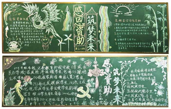 为进一步宣传国家资助政策,增进我院学生对资助政策的了解,提高学生立志成才、知恩感恩的意识,交通工程学院团总支特举办以“青春筑梦新时代,诚信资助向未来”为主题的黑板报评比活动。