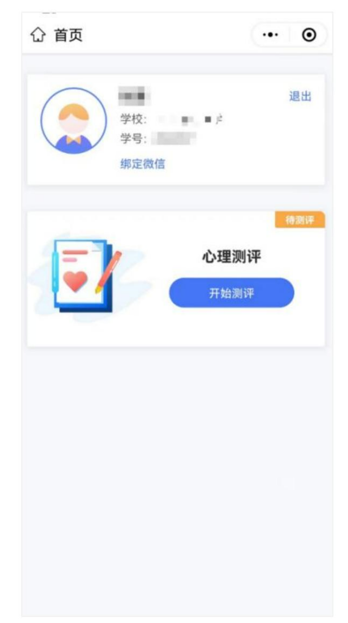 第四步:登录后可看到个人信息和心理测评两个模块。点击“绑定微信”,下次即可一键登录,无需再进行手机号验证码操作。