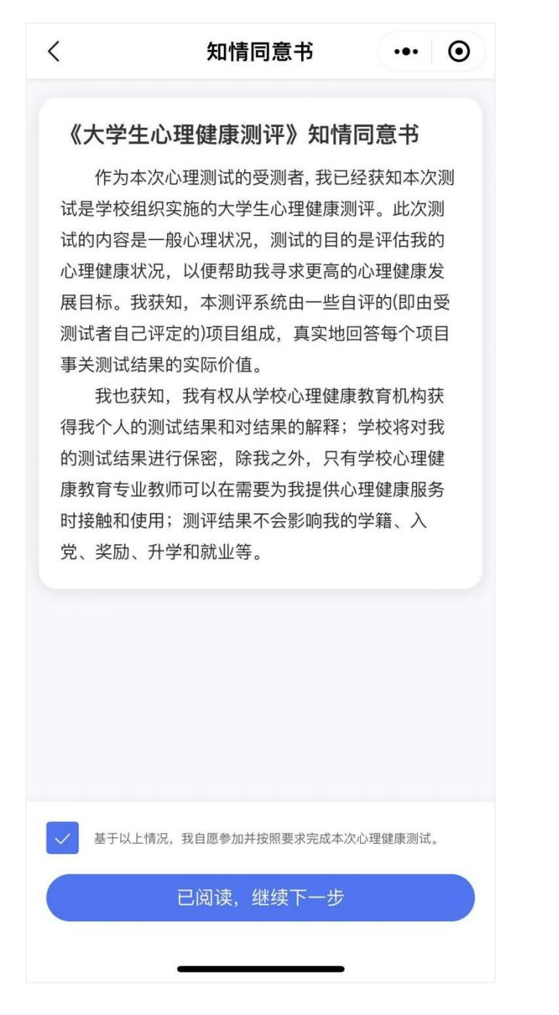 第五步:点击“开始测评”,阅读“知情同意书”,勾选“基于以上情况,我自愿参加并按照要求完成本次心理健康测试”,点击“已阅读,继续下一步”。
