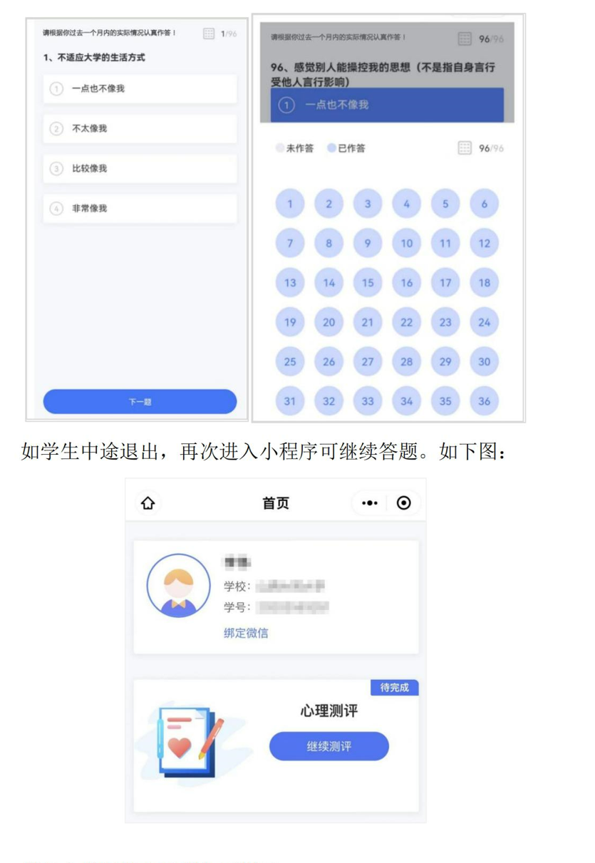 1、测评共有96道题,不限制作答时间,学生要根据自身真实情况作答。页面右上角提供答题卡功能,可以查看答题是否遗漏,96道题全部作答,方可提交测评。