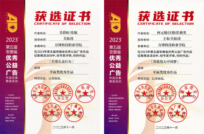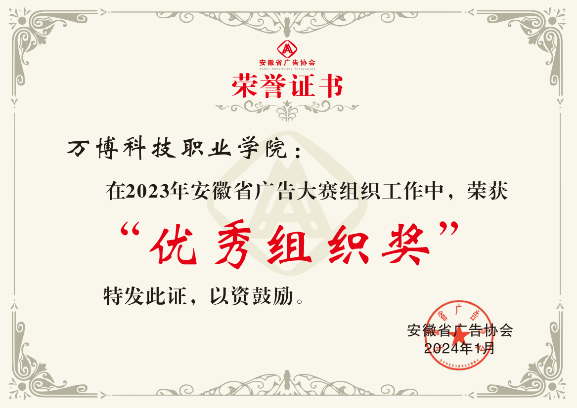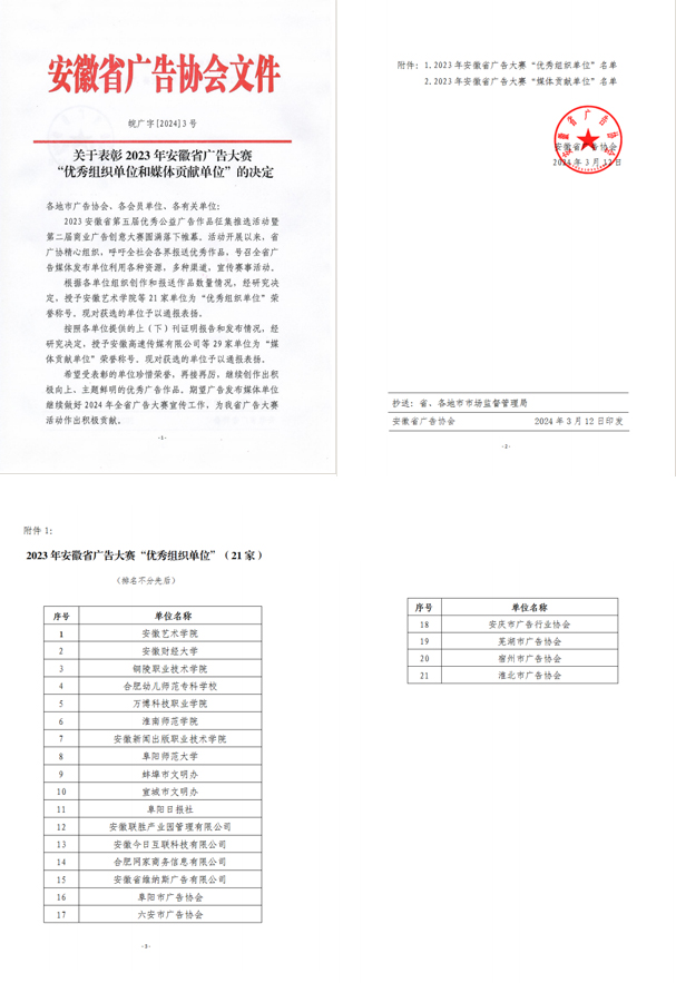 近日,由安徽省市场监管局、省文明办、省教育厅、省经济和信息化厅、省文化和旅游厅、省广播电视局等部门联合主办,安徽省广告协会承办的第五届安徽省优秀公益广告作品征集推选活动和第二届安徽省商业广告创意大赛落下帷幕,我校凭借出色的组织能力和卓越的创意表现,再次荣获“安徽省广告大赛优秀组织单位奖”。我校已经连续四年荣获这一殊荣,充分展示了学校在广告教育和实践领域的教学成果。