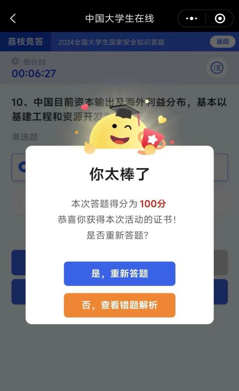 2024年4月10日开始,我校积极组织团员青年通过关注中国大学生在线网站或微信公众号,参与“全国大学生国家安全知识答题”活动,通过以赛促学、学用结合,有效引导大学生践行总体国家安全观,使关心国家安全、维护国家安全成为广大师生的思想共识和行动自觉,让国家安全教育真正入眼、入脑、入心、入行。