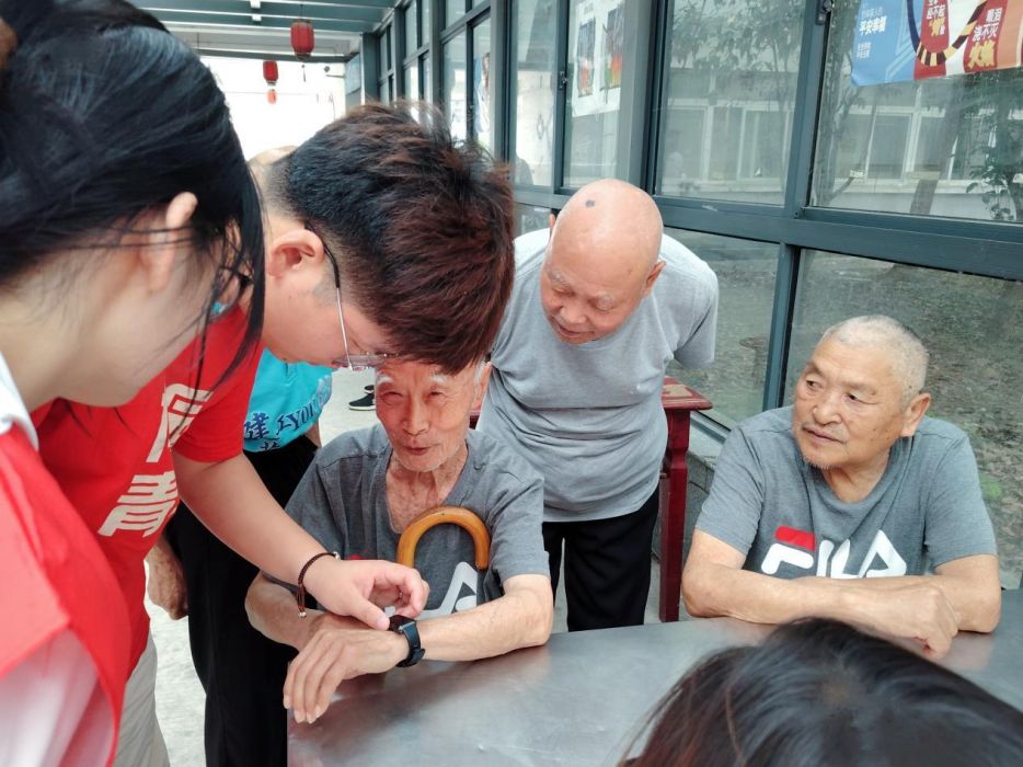 实践队前往肥东县大爱老年公寓,开展丰富多彩的志愿服务活动,为老人们送去温暖与关怀。在活动过程中,队员们展现出了极高的热情。他们与老人们亲切交流,关心地询问他们的身体状况和生活情况,细致入微,充满关爱。现场氛围融洽,温馨而欢乐。有的队员陪伴在老人身边,与他们畅谈生活琐事,耐心倾听老人们的故事和心声;有的队员关注老人的需求,帮助老人调节智能手环的设置和校准时间,让他们感受到了关怀和温暖。老人们被志愿者们的热情和关怀所感动,脸上洋溢着幸福的笑容。最后,队员们帮助工作人员打扫食堂卫生,整理公寓的菜园,为工作人员分担农务。