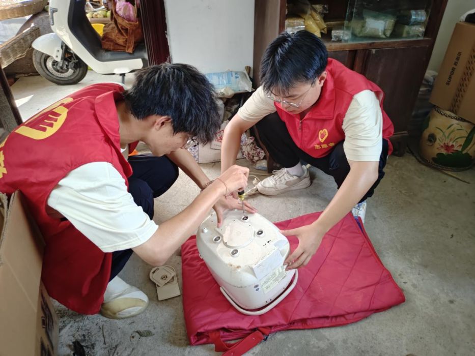 在村委会工作人员的带领下,队员们走家串户,充分发挥自身专业知识向老人们讲解家电使用注意事项,义务维修小家电。一位老人家拿出故障已久的电饭煲,两位队员熟练地拆开外壳,仔细检查线路和零件,找到故障所在并完成维修。队员们帮助行动不便老人家的院子里除草、打扫卫生、晾晒被子。
