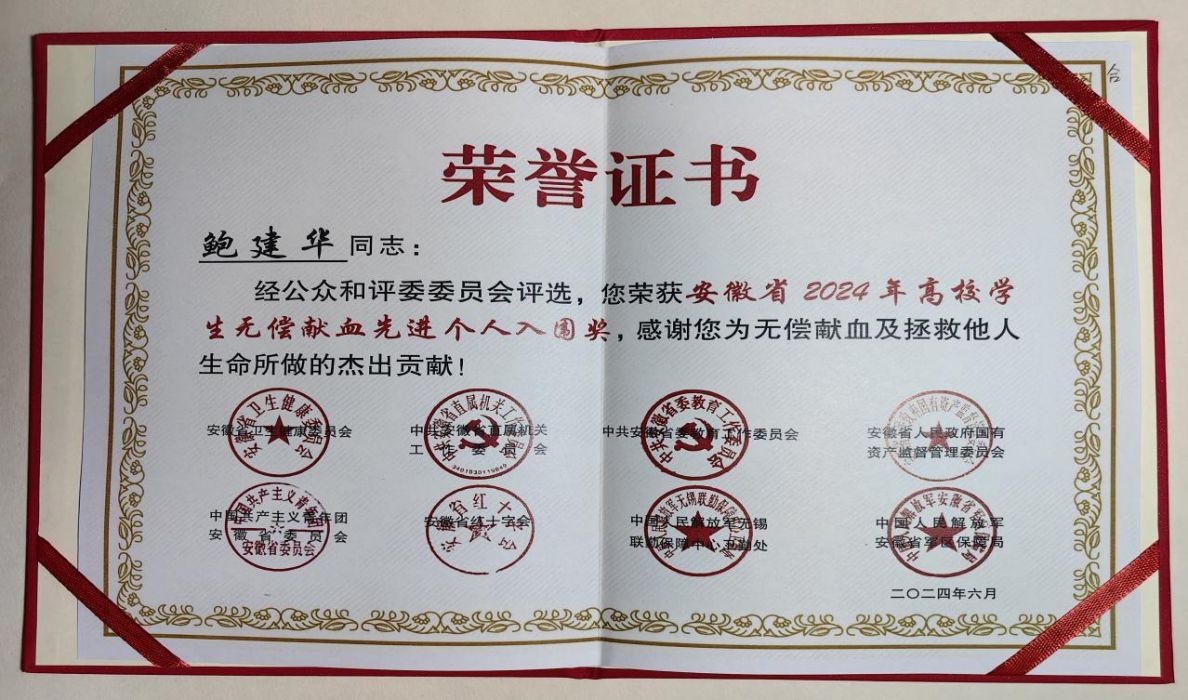 近日,安徽省卫生健康委员会、省教育工委、团省委等8个单位联合印发《关于安徽省2024年无偿献血公益活动先进典型评选结果的通报》,我校智能信息学院鲍建华同学,荣获“安徽省2024年高校学生无偿献血先进个人入围奖”。