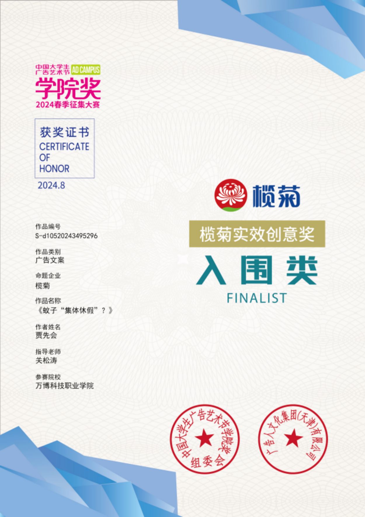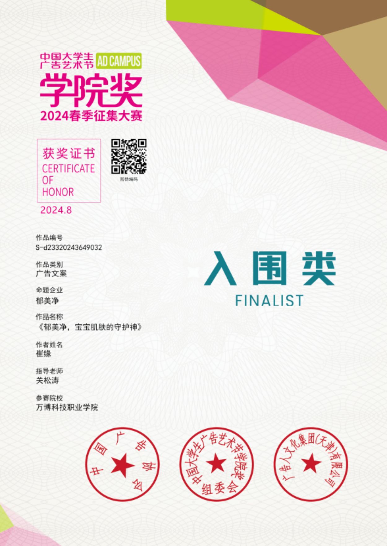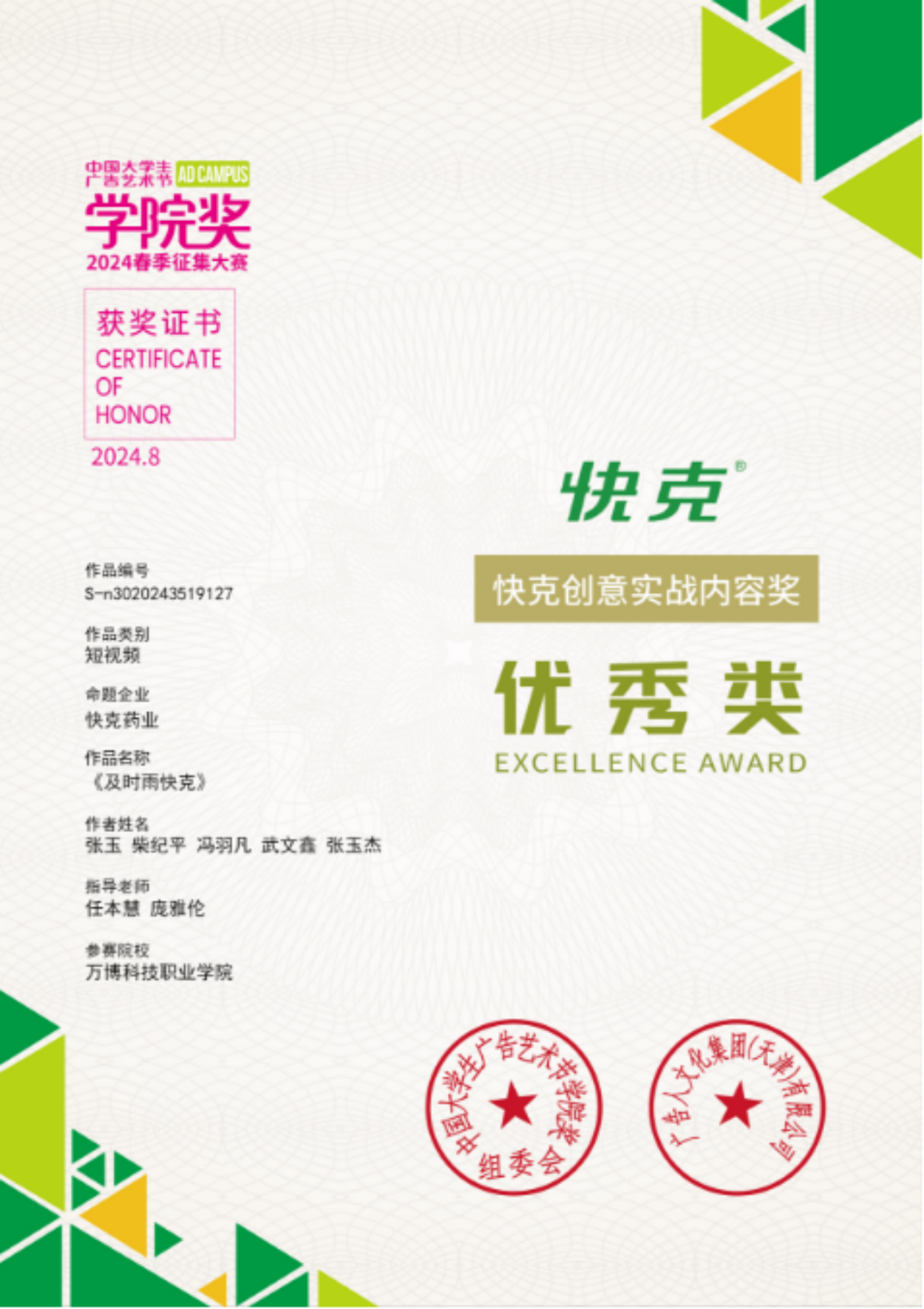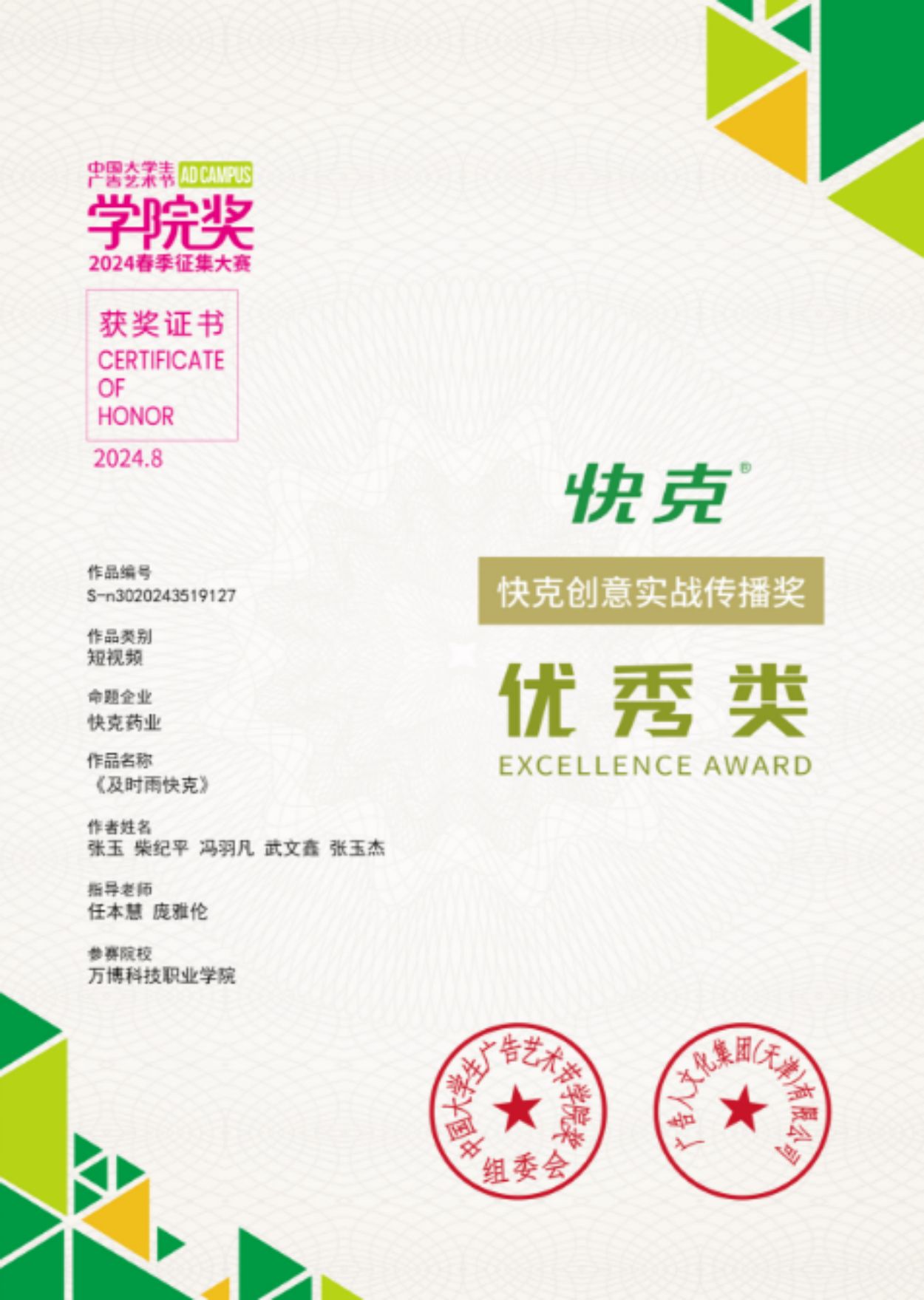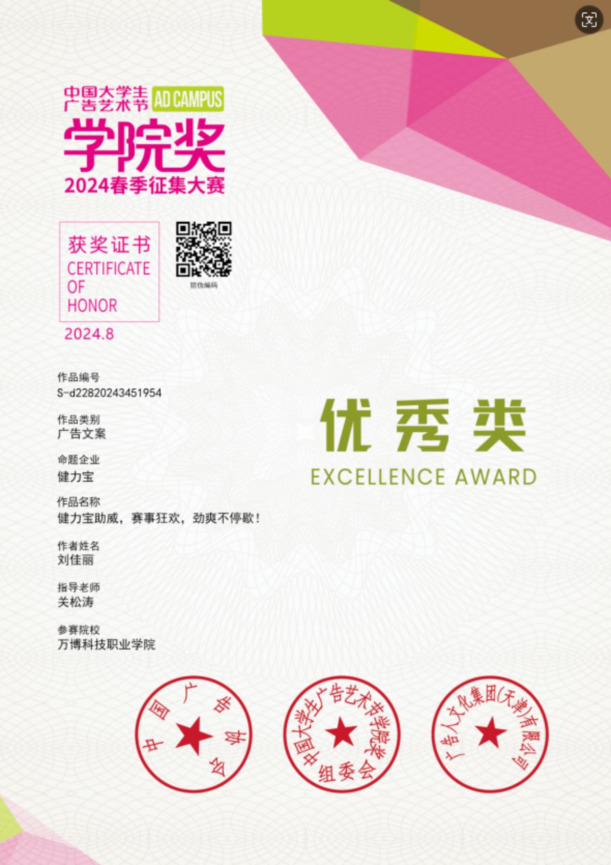 此外,我校在2024中国大学生广告艺术节·学院奖春季赛中荣获多项奖,其中荣获大赛常规优秀奖14项,佳作奖143项,企业奖项4项,传播奖项2项,优秀指导教师3人,获奖作品类别涵盖广告文案类、平面广告类、视频传播类和企业实效创意类等。