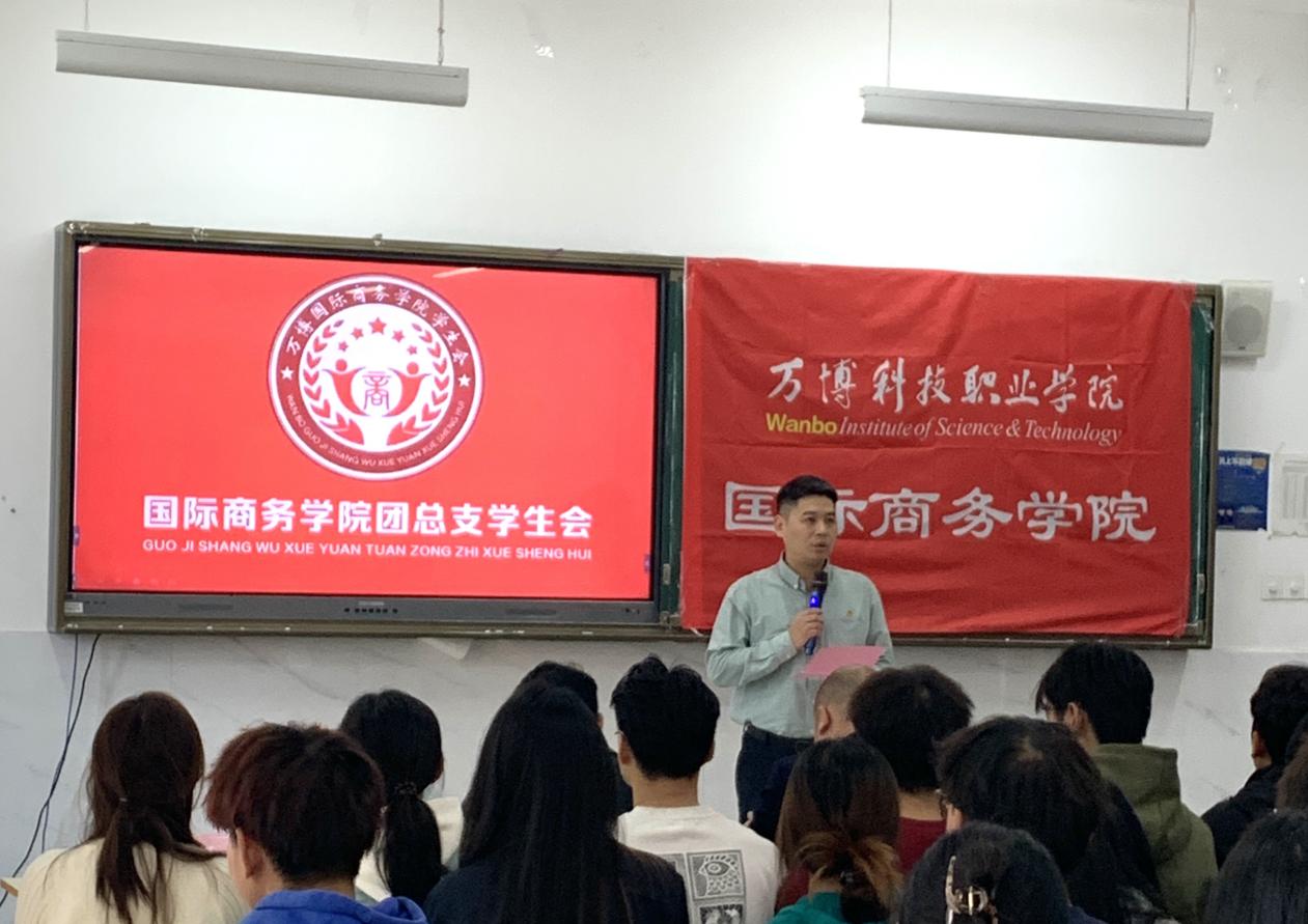10 月 23 日,国际商务学院团总支第六次学生代表大会在教学楼2101教室召开。国际商务学院党支部书记、副院长司斌斌,教学秘书汪慧,学工助理黄吉胜,团总支书记周莹,校团委许鑫宇,辅导员王修盼以及各班级学生代表出席本次大会。