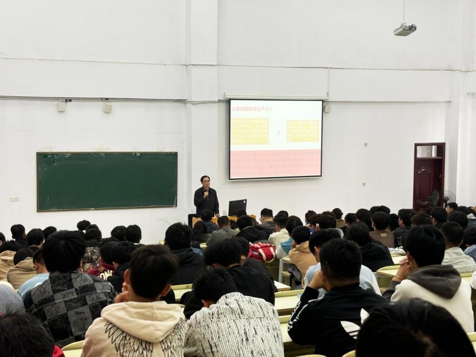 课堂上,鲍习生围绕《新质生产力与换道超车——以新能源汽车为例》主题,从“发展新质生产力是实现中国式现代化的必由之路”、“建设汽车强国是我国经济社会高质量发展的必由之路”、“发展新能源汽车是我国从汽车大国迈向汽车强国的必由之路”、“拥抱创新是现在青年成长成才的必由之路”四个方面展开,运用丰富的资料、新鲜且详实的数据、耳熟能详的案例,带领同学们共同学习国家重大发展战略,共同感悟发展新质生产力的万千气象,共同探讨新质生产力是如何助力新能源汽车产业实现换道超车,重塑全球汽车产业的竞争版图。