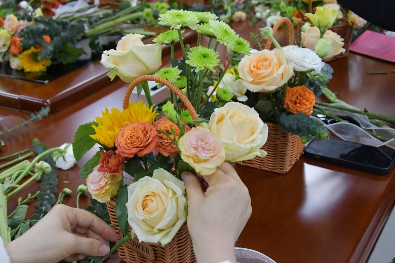 活动伊始,校工会女工委员金晶致辞,向参加活动的女教职工致以节日祝福。她表示,活动旨在通过艺术创作,传递对女性群体的关怀,激励大家在工作和生活中展现自信与优雅。活动特邀专业花艺师现场教学,从花材选择、色彩搭配到造型设计,细致讲解插花技巧,并同步示范操作步骤。女教职工们在专业花艺师的指导下修剪枝叶,构思布局,将玫瑰、康乃馨、向日葵等花卉巧妙组合,创作出各具特色的花艺作品。