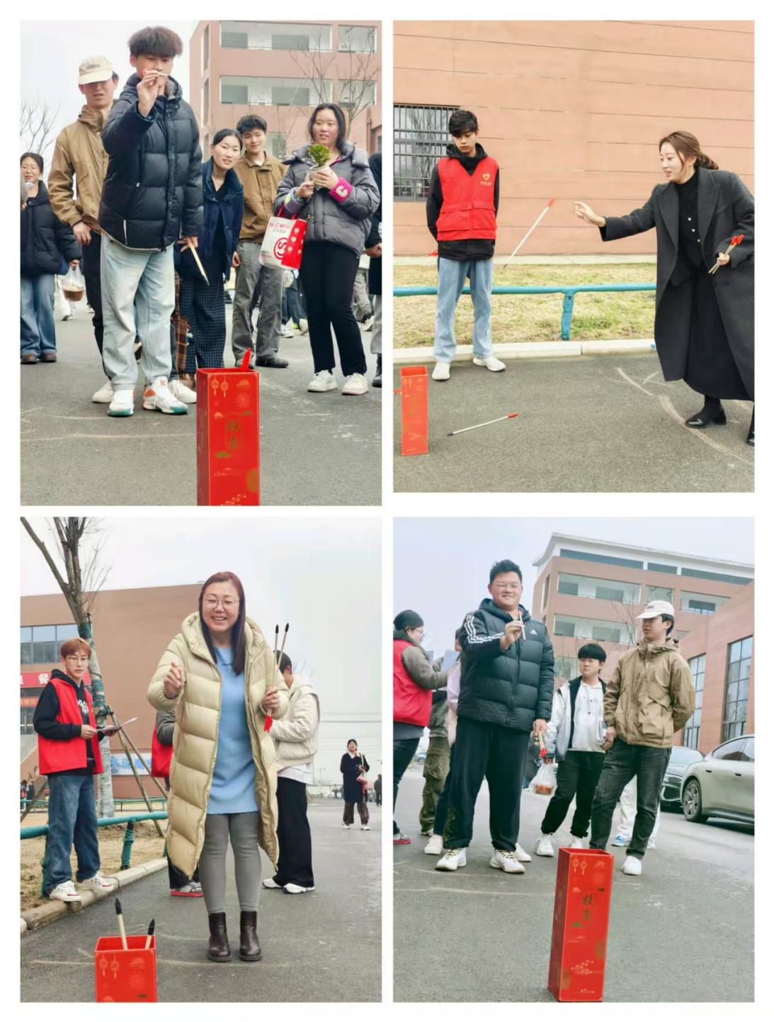 与此同时,一旁的投壶游戏区同样热闹。古雅的壶具稳稳地放置在场地中央,参与的师生屏气凝神,紧握箭矢,眼神专注地盯着壶口。每一次成功入壶,都会引发周围的师生的热烈掌声和欢呼声,获奖的师生们洋溢着喜悦的笑容。