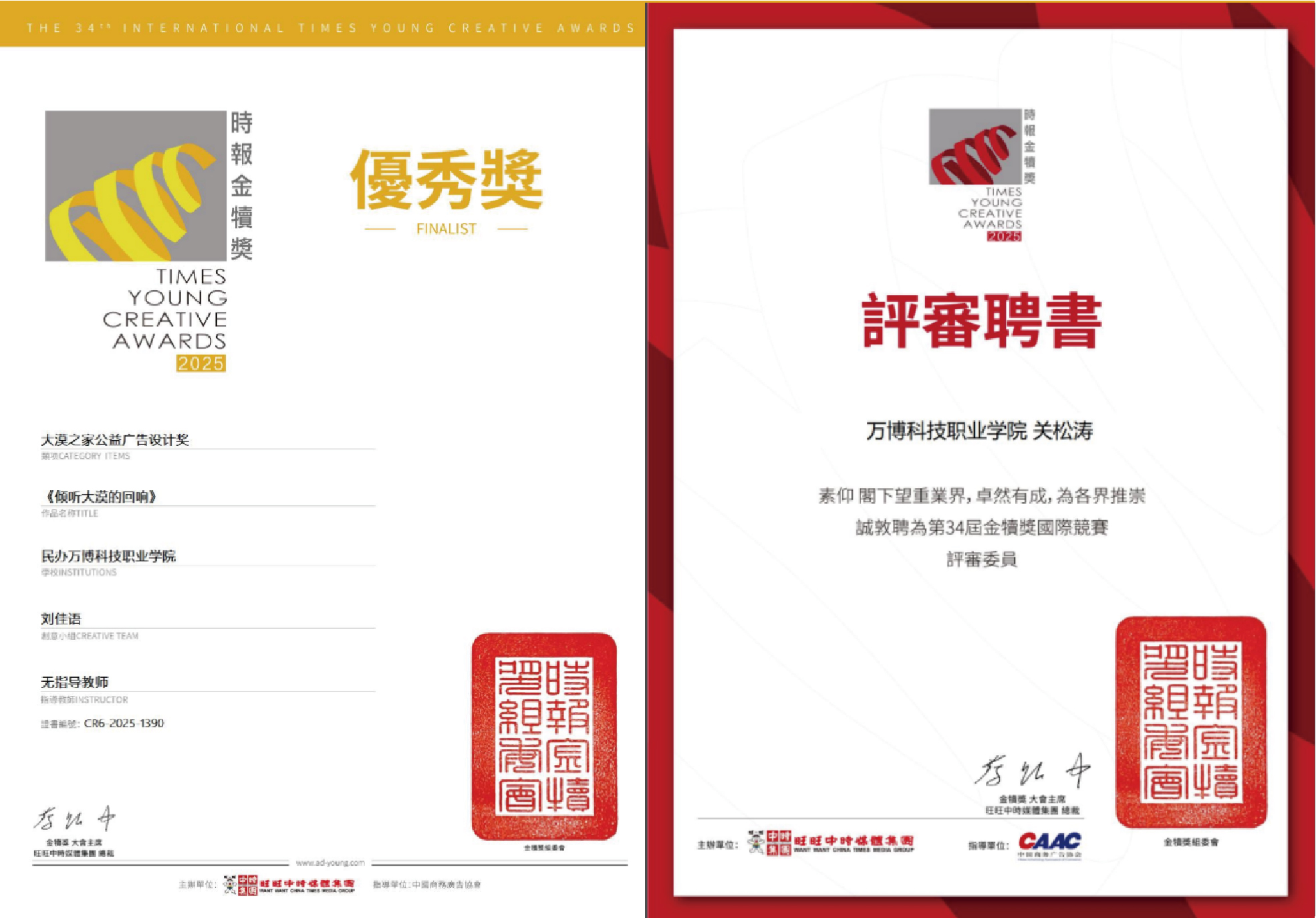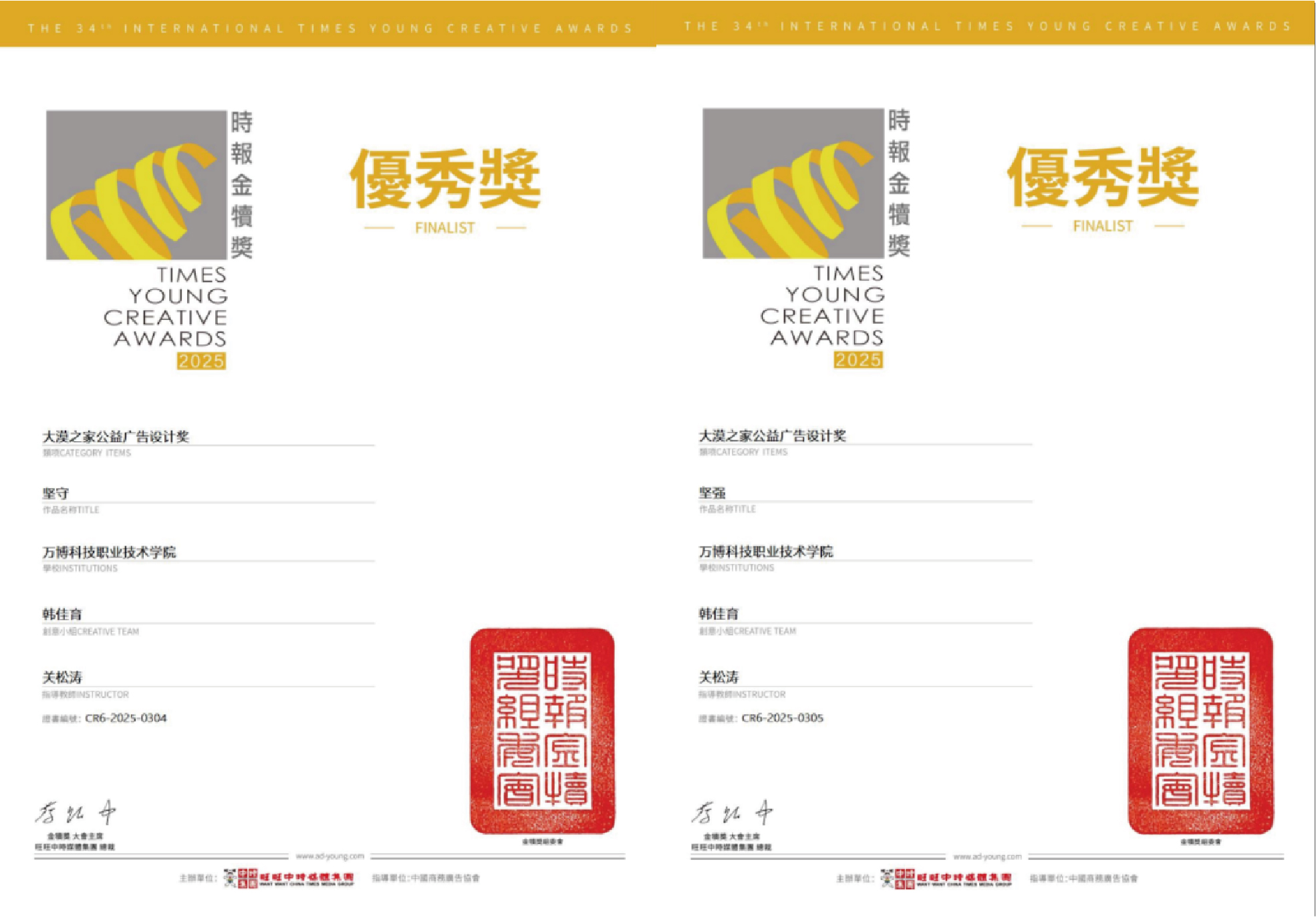 据悉,时报金犊奖创办于1992年,截至2025年已经连续举办34年,是由中国时报创办,旺旺中时媒体集团主办,中国商务广告协会指导的全球华文青年创意大赛,是全球华人地区历史悠久、覆盖面广的华文青年创意活动。因作业严谨、专业权威,被行业称为“青年创意的奥斯卡”,是华人圈历史最悠久的青年创意奖项。本次是我校师生第一次参加此项竞赛,是艺术设计类专业在国际性学科竞赛中的一次检验与突破。