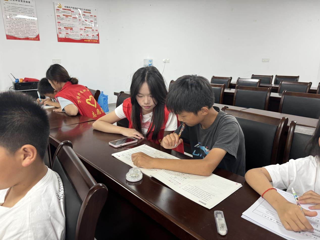 游戏过后,实践队员们迅速化身“学习伙伴”,针对不同孩子的学习需求,开展个性化辅导。书桌前,他们俯身贴近孩子,耐心细致地解答暑期作业中的难点——无论是数学题的逻辑梳理,还是语文阅读的深度解析,都采用一对一讲解、趣味化解读的方式。难题在轻松的氛围中迎刃而解,孩子们求知的眼睛亮了起来,笔尖在纸上自信地沙沙作响,学习信心在有效的互动中稳步提升。
