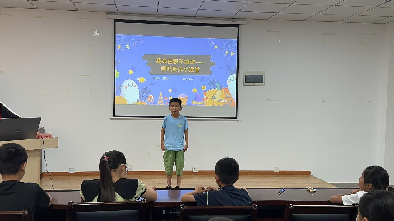 安全知识课堂摇身一变,成为充满趣味的互动乐园。实践队员们化身“趣味导师”,将严肃的安全常识巧妙融入孩子们喜闻乐见的场景。防诈骗环节通过“哪吒专场”,以“我命由我不由诈”的标语牌,激发孩子们的兴趣,提高孩子们的安全意识;防火防灾防溺水课堂则成了“小勇士展示台”,志愿者通过小小老师的方式激励孩子们踊跃上台向大家展示正确的呼救姿势和自救施救方法,不仅提高了孩子们的安全意识和自信心,还锻炼了孩子们的展示和表达能力;暑期食物安全讲座上志愿者更是带领孩子们扮演成了“零食侦探”,这堂食物安全课,没有难懂的术语,只有看得见的变质食物、认得出的包装标志和孩子们熟悉的零食。