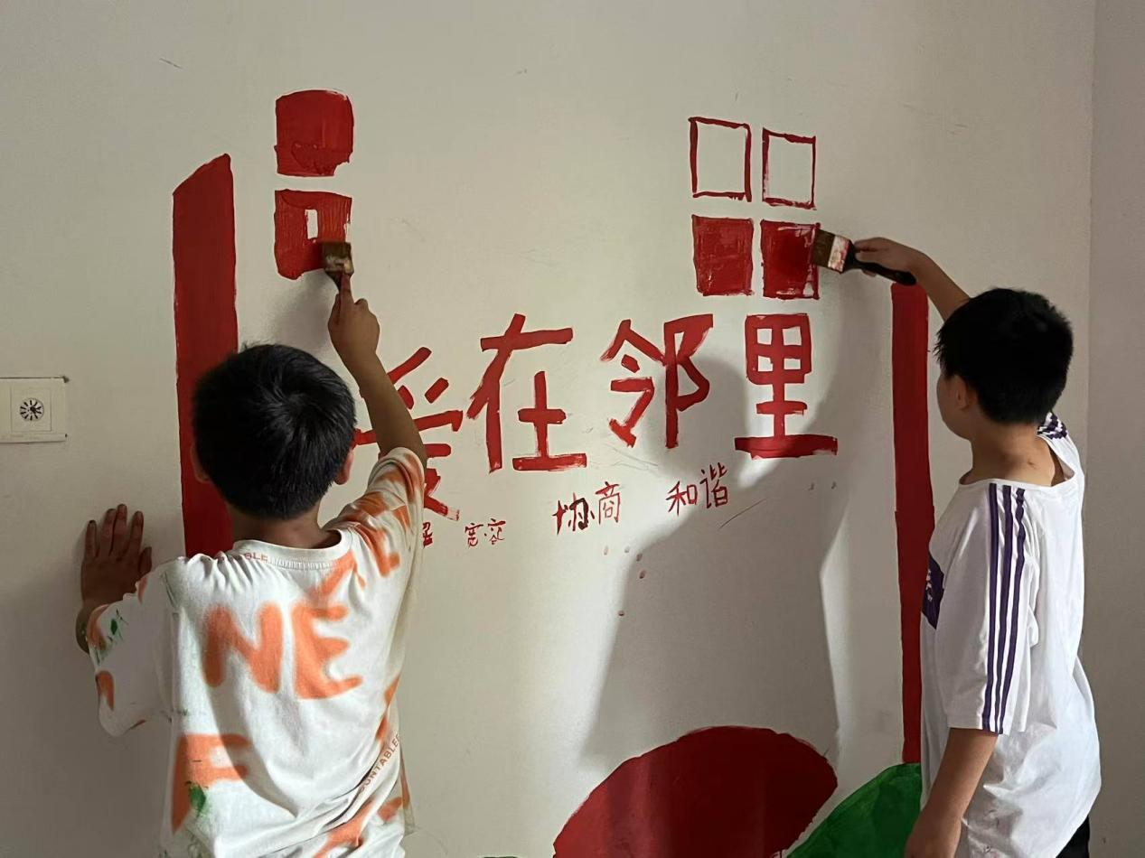 “我是小小彩绘师”环节,社区墙面变身巨大“创意画布”。孩子们围在调色盘旁,小手蘸满斑斓颜料,眼中闪烁着兴奋的光芒。在志愿者耐心协助调和色彩、扶正画笔下,童真的想象在墙面上恣意挥洒。孩子们清脆的笑声裹着淡淡的颜料清香,在空气中弥漫,仿佛将最明丽的夏日色彩都揉进了社区的风景里。