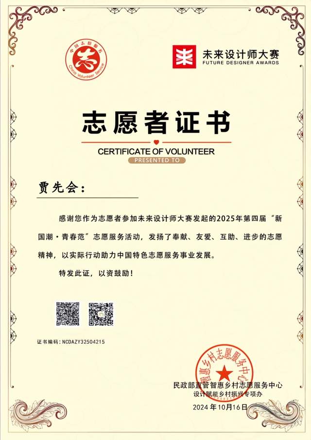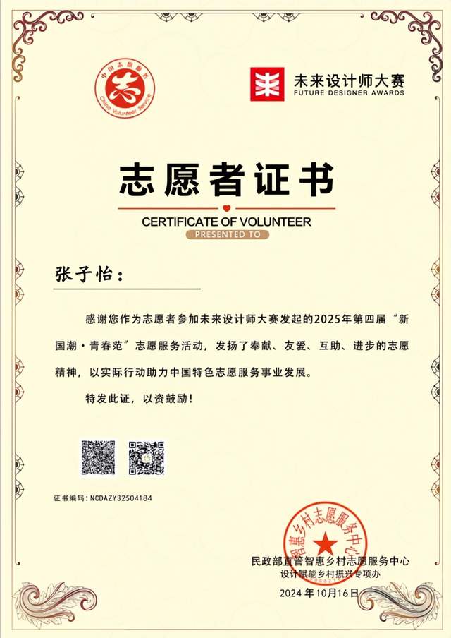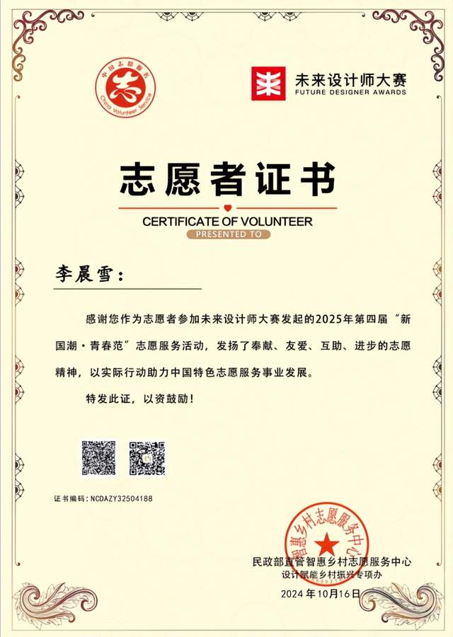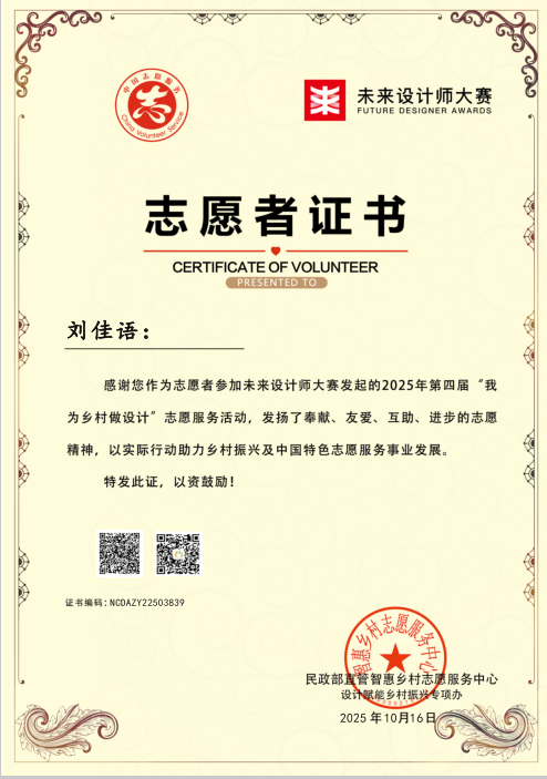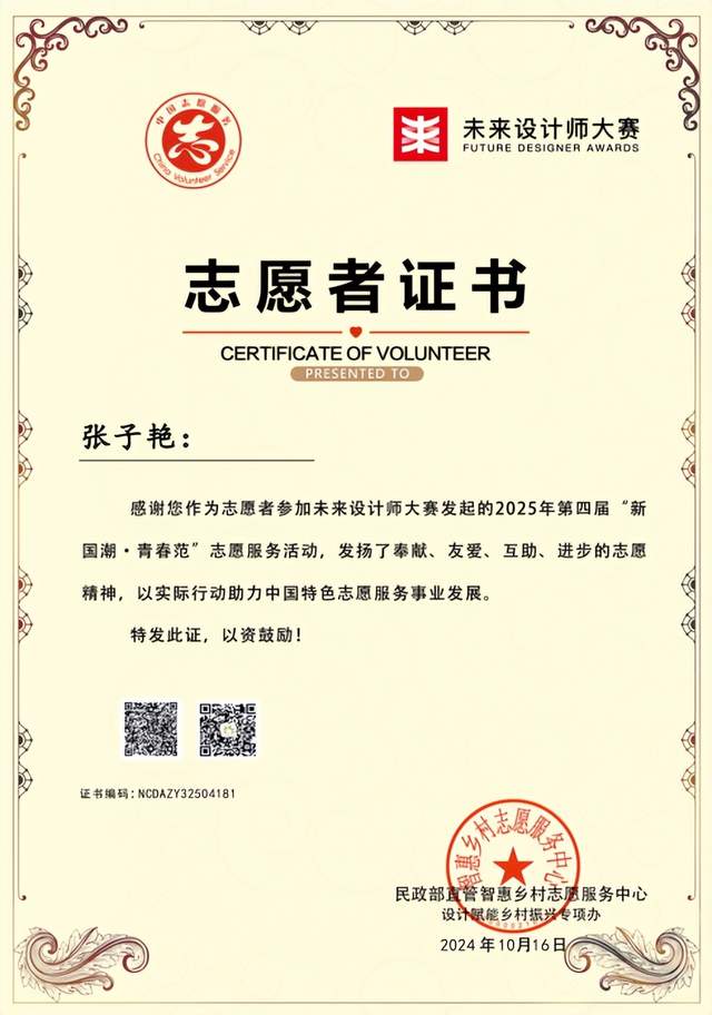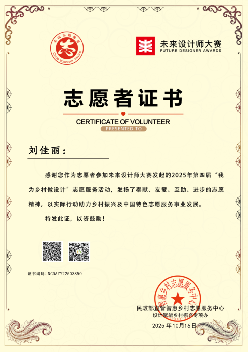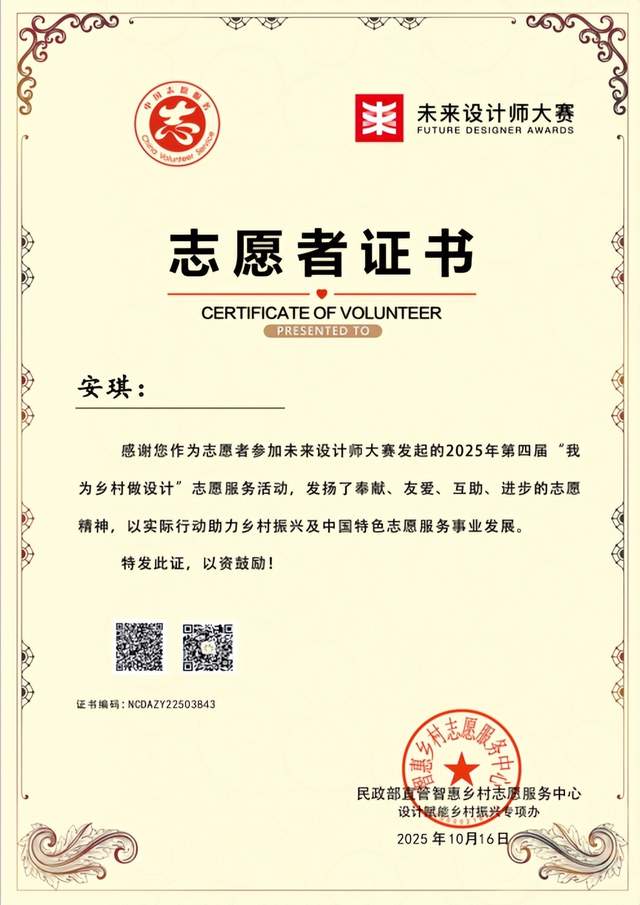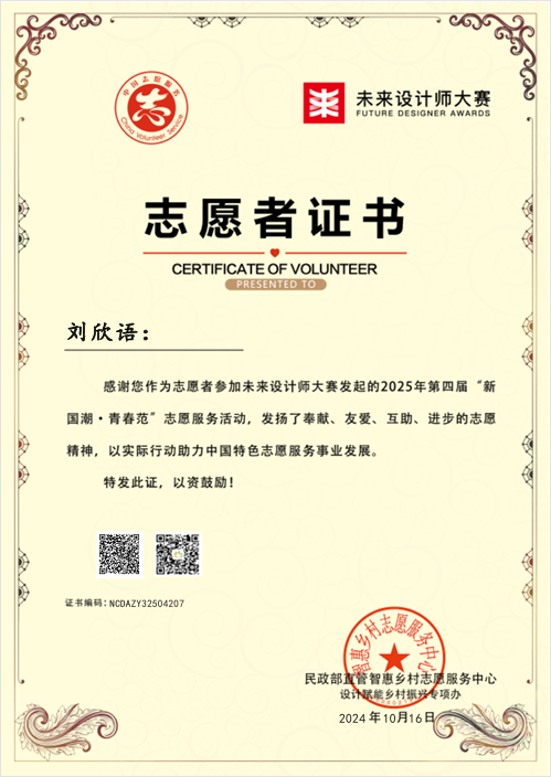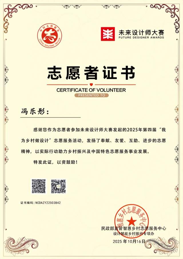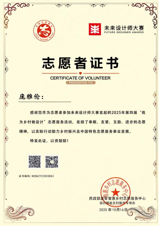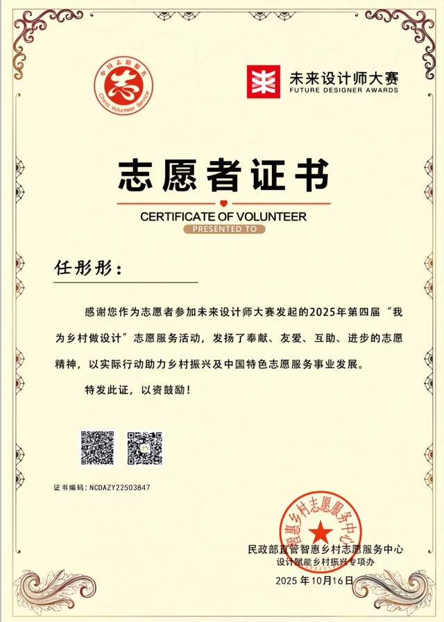 近日,由民政部智惠乡村志愿服务中心与2025第13届未来设计师·全国高校数字艺术设计大赛组委会联合发起的第四届“我为乡村做设计”和“新国潮·青春范”志愿服务活动圆满结束。为弘扬“奉献、友爱、互助、进步”的志愿精神,表彰在活动中表现突出的个人,主办方于2025年10月18日为我校40余名师生颁发了“我为乡村做设计”、“新国潮·青春范”志愿服务活动“先进个人”荣誉证书。这一殊荣不仅是对我校师生专业能力与服务热情的充分肯定,也是对我校实践育人工作成效的认可。